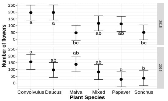 Differences between treatments in the average number of flowers in both years of the study (2015 and 2016). Values are the estimated marginal means from the general mixed-effects model. Bars show confidence intervals at the 0.95 level. Letters indicate differences between treatments derived from post hoc pairwise comparisons using the Tukey method for p-value adjustment. Contrasts were performed between treatments and for each year separately. Flower species are indicated by genus.