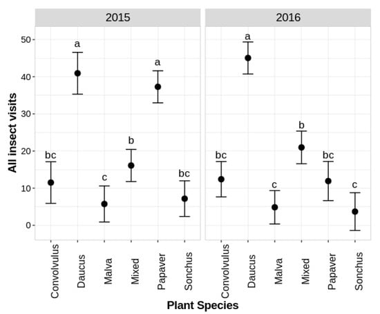 Differences in the average number of insect visits per five-minute period to the flower treatments in both years of the study (2015 and 2016). Values are the estimated marginal means from the general mixed-effects model accounting for the number of flowers in the plots. Bars show confidence intervals at the 0.95 level. Letters indicate differences between treatments derived from post hoc pairwise comparisons using the Tukey method for p-value adjustment (at p < 0.05). Contrasts were performed between treatments and for each year separately. Flower species are indicated by genus.