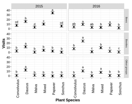 Differences in the average number of visits from bees, beetles, and other insect groups to the flower treatments in both years of the study (2015 and 2016). Values are the estimated marginal means from the general mixed-effects model accounting for the number of flowers in the plots. Bars show confidence intervals at the 0.95 level. Letters indicate differences between treatments for a given year and insect taxonomic group derived from post hoc pairwise comparisons using the Tukey method for p-value adjustment (at p < 0.05). Flower species are indicated by genus.