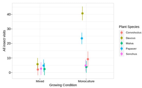 Differences in the average number of insect visits when plants were grown in monocultures vs. mixed plots. Values are the estimated marginal means from the general mixed-effects model accounting for the number of flowers in the plots. Bars show confidence intervals at the 0.95 level. Flower species are indicated by genus.