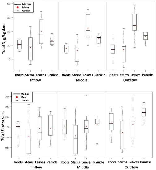 The average values of total nitrogen and phosphorus in individual parts of the reeds were higher than values given by Ozimek and Renman []. The authors report that the concentration of nitrogen in the leaves of reeds was 3.5%, 0.9% in the stems, and 0.6% in the rhizomes; total phosphorus, on the other hand, was characterized by values of 0.15% in the leaves and 0.08% in the stems and rhizomes.