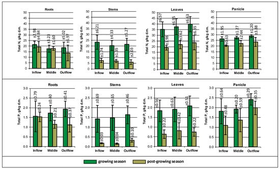 The study confirmed that during the vegetative period of plants, the amount of accumulated total nitrogen and phosphorus in individual parts of reeds was higher than post-vegetation (Figure 3). The highest differences in total nitrogen and phosphorus contents in the vegetative and post-vegetative periods were observed in the stems of the plant. In the vegetative period, reed stems accumulated on average 2.77 g/kg d.m. of nitrogen and 1.51 g/kg d.m. of phosphorus, whereas in the post-vegetative period, the respective values of these elements were 6.69 and 0.22 g/kg d.m.