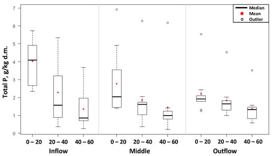 Similar relationships were observed in regards to total phosphorus. The average concentration of phosphorus at a depth of up to 20 cm was 3.01 ± 1.6 gP/kg d.m. (range of values: 1.41 ÷ 6.92 g/kg d.m.). In deeper layers of the bed, phosphorus content was lower. At the level of 20–40 cm, the accumulation of phosphorus was in the range from 0.37 to 6.28 gP/kg d.m., on average, 1.99 ± 1.5 gP/kg d.m. On the other hand, at the depth of 40–60 cm, the accumulation of phosphorus averaged 1.39 ± 1.2 gN/kg d.m. (range of values: 0.22 ÷ 6.18 g/kg d.m.).