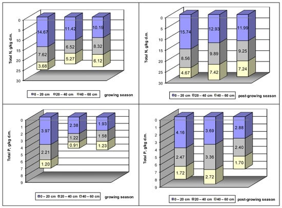 The penetration of nutrients deeper into the hydrophytic subplot increased with decreasing distance to the outflow of sewage from the wetlands. The amount of nitrogen and phosphorus at individual depths of the bed undergoes seasonal changes. The results of the studies carried out showed that, during the post-vegetative period, the content of total nitrogen and total phosphorus in the soil at individual depths was higher than in the vegetative season (Figure 5). These differences were the highest in the layer of up to 20 cm depth. During the period of full plant development, when the contents of total nitrogen in individual parts of the reed were high, a lower concentration of nitrogen in the wetland bed was noted. In January, the concentration of nitrogen in the plant was low, whereas the nitrogen contents in the wetland bed were the highest for the entire period of the studies. In the off-season, increased penetration of nutrients to deeper layers of the bed was also observed.