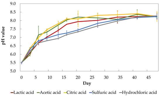 3.2.2. Acidification of All Slurries with Sulfuric and Lactic Acid