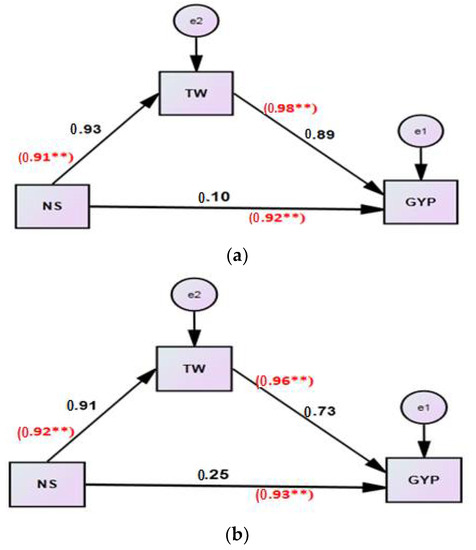 (a) The path analysis for direct and indirect effects and Person correlation (r) of (NS) as independent variable and (TW) as mediator variable and (GYP) as dependent variable of first season. (b) The path analysis for direct and indirect effects and Person correlation (r) of (NS) as independent variable and (TW) as mediator variable and (GYP) as dependent variable of second season (** indicates the different significance at p < 0.01 level).