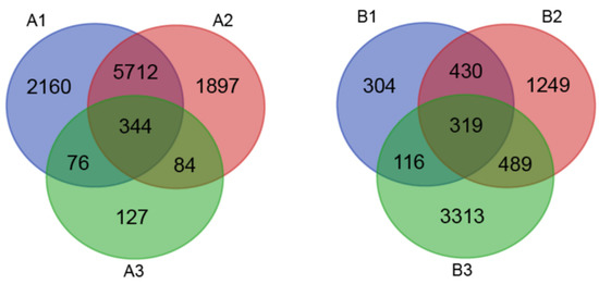 Venn diagram for differentially expressed genes of three rice varieties, LYP9, PA64s and 93-11, between the control (CK) and two salt (S) treatments. Where, A1 (CKp vs. S-p_7), B1 (CKp vs. S-p_14), A2 (CKy vs. S-y_7), B2 (CKy vs. S-y_14), A3 (CKl vs. S-l_7), B3 (CKl vs. S-l_14).