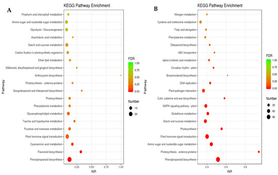 Top enriched KEGG pathways of the DEGs in PA64s 93-11 and LYP9 at 7- and 14-day stress treatments. Here, (A) KEGG pathway of DEGs at 7 days, (B) KEGG pathway of DEGs at 14 days. The corresponding pathways are listed on the Y-axis, and the rich factor values are listed on the X-axis. Different sized circles represent different numbers of DEGs, whereas their color (FDR) represents the adjusted p-value.