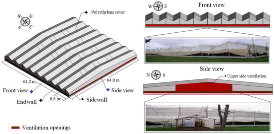 The greenhouse had ventilation openings on the sidewalls and endwalls with an effective vertical opening of 1.1 m, resulting in a ventilation surface area of 275.4 m2. This ventilation area was complemented by an upper ventilation area located on the west side of the greenhouse of 51.5 m2, which brought the total ventilation area to 8.34% of the covered floor area. These ventilation areas are managed based the producers’ own criteria. In general, these ventilation areas are opened manually in the early morning hours (6:00 or 7:00 h), and they are also closed manually in the afternoon hours (15:00 or 16:00 h) or at the time of rainfall. The minimum and maximum heights above the gutter were 3.0 m and 4.5 m and above the ridge roof 4.7 m and 6.2 m, respectively.