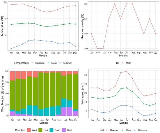 Figure 2 shows the annual variation of the several climatic variables calculated from 30 years of historical data. The average temperature presents a value of 13.23 °C with mean maximum and minimum values of 18.45 °C and 7.53 °C. The average relative humidity value is 83.6%. These values coincide with those reported by Cortés-Rojas et al. [15].