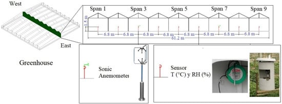 For the validation of the numerical model, an experimental trial was conducted that included the collection and recording of climate data inside and outside the greenhouse. This recording was performed for a total of 60 days (1 March–29 April 2018) with a frequency of ten-minute measurement. In the outdoor environment, variables such as temperature (°C), solar radiation (Wm−2), wind speed (ms−1), and wind direction were recorded. Meanwhile, the temperature behavior of a cross section in the middle length of the greenhouse was recorded by using 9 T-type thermocouples (range: −(40) to 70 °C, resolution: 0.1 °C, accuracy: ±0.3 °C) coupled to Cox recorders (Cox-Tracer Junior, Escort DLS, Edison, NJ, USA). Finally, the air velocity was recorded by using 2 sonic anemometers (Mod. WindMaster 3D Anemometer, Gill Instrument Ltd., Hampshire, UK; range: 0 to 50 ms−1 and 0 to 359°, resolution: 0.01 ms−1 and 0.1°) (Figure 4).