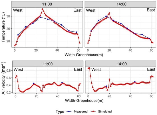 This validation was complemented with a numerical analysis in which for temperature, the RMSE and MAPE values were found to be 0.77 °C and 2.85% for hour 11, while for hour 14, they were 1.51 °C and 1.98%, respectively. Likewise, for air speed at hour 11, RMSE and MAPE values were 0.04 ms−1 and 7.63%, and 0.05 ms−1 and 9.78% were obtained for hour 14, respectively. These RMSE values are similar to those reported in other greenhouse natural ventilation studies [7,30]. Also, having MAPE values less than 10%, it can be concluded that the model has a highly accurate forecasting capability according to what is reported by Montaño Moreno et al. [31].
