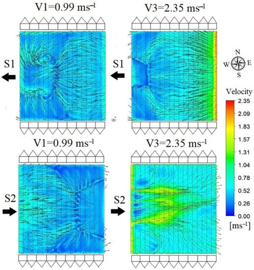 Simulated airflow patterns for scenarios S1 (direction the wind is blowing: west; V1: 0.99 ms−1 and V3: 2.35 ms−1) and S2 (direction the wind is blowing: east; V1: 0.99 ms−1 and V3: 2.35 ms−1).