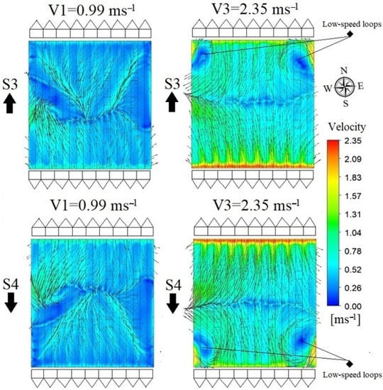 Simulated airflow patterns for scenarios S3 (direction the wind is blowing: north; V1: 0.99 ms−1 and V3: 2.35 ms−1) and S4 (direction the wind is blowing: south; V1: 0.99 ms−1 and V3: 2.35 ms−1).