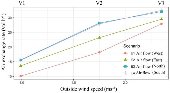 Figure 8 shows the air exchanges rates in volumes per hour for each of the simulated scenarios. For the four simulated scenarios S1–S4, it was observed that there is a direct relationship of the renewal rate value with the wind speed in the outdoor environment, which is in agreement with a large number of natural ventilation studies conducted in different types of greenhouses [7,30,36].