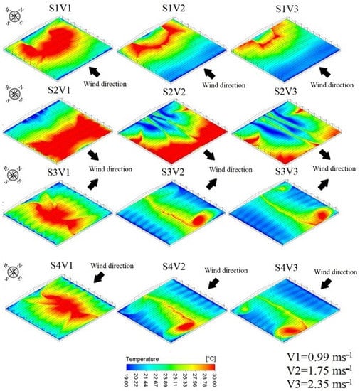 Spatial behavior of temperature for 12 simulated scenarios; S1 (direction the wind is blowing: west; V1: 0.99 ms−1; V2: 1.75 ms−1 and V3: 2.35 ms−1); S2 (direction the wind is blowing: east; V1: 0.99 ms−1; V2: 1.75 ms−1 and V3: 2.35 ms−1); S3 (direction the wind is blowing: north; V1: 0.99 ms−1; V2: 1.75 ms−1 and V3: 2.35 ms−1); and S4 (direction the wind is blowing: south; V1: 0.99 ms−1; V2: 1.75 ms−1 and V3: 2.35 ms−1).