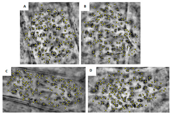 Nodes (10 cm) were planted in 300 mL plastic pots with coarse sand and Hoagland solution. Stems were grown for three weeks in a controlled chamber (conditions the same as the previous stage) to obtain new fresh roots. After the growth period, root meristematic zones (tips) were cut to look for the greatest cell division activity, following the technique of Haddadchi et al. and Bucci et al. for dyeing [9,11]. Chromosomes of 50 metaphasic cells (five cells/five roots/two plants) were counted for each clone using a Leitz DMIRB microscope (Chicago, IL, USA) and Fiji software (Image J, Wisconsin, USA); pictures were taken with a Leica DFC 360 FX camera (Chicago, IL, USA) (Figure 1).