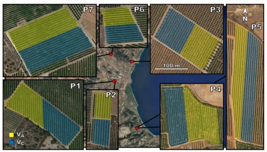 Location and maps of the seven experimental plots (P1–P7). The VC (conventional volume) block is blue shaded and the VA (adjusted volume) block is yellow shaded. Date of satellite images: 5 July 2016; source: Google Earth Pro 7.3.2. Geographic coordinates: P1 (39°26′32″ N, 0°33′23″ W), P2 (39°26′43″ N, 0°32′18″ W), P3 (39°39′14″ N, 0°18′26″ W), P4 (38°56′46″ N, 0°14′15″ W), P5 (38°56′56″ N, 0°14′32″ W), P6 (39°43′43″ N, 0°35′28″ W) and P7 (39°43′58″ N, 0°35′33″ W).