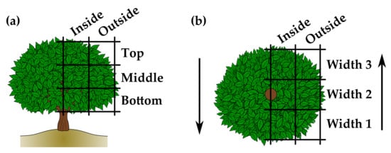 Quadrants of the canopy where water sensitive papers were placed. (a) Side view across the row and (b) top view of a standard citrus tree. Arrows indicate the forward direction of the airblast sprayer.