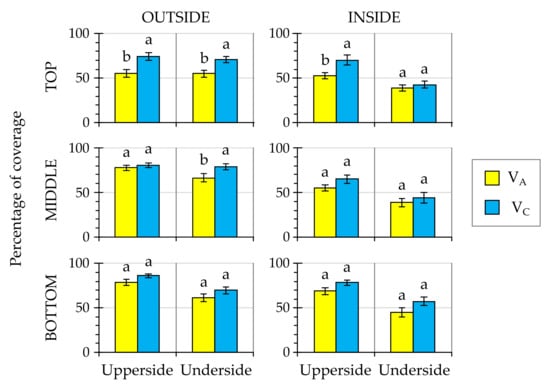 Spray coverage (%) (mean value with standard error bar) obtained on the upperside and underside of leaves at three heights (top, middle, bottom) of the outside and inside parts of clementine tree canopies after application of conventional (VC) and adjusted (VA) volume rates considering the 13 evaluations in the orchards on seven locations over the years 2016 and 2017. Different letters above the bars within each height × depth × leaf side combination indicate significant differences (LSD test, p < 0.05).