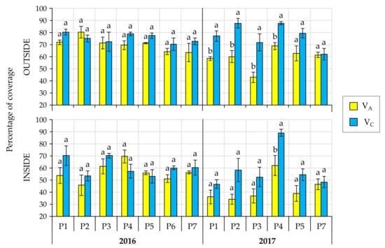 Spray coverage (%) (mean value with standard error bar) obtained on the outside and inside parts of clementine tree canopies after application of conventional (VC) and adjusted (VA) volume rates in each orchard on different locations (P1–P7) over the years 2016 and 2017. Different letters above the bars for each coverage evaluation indicate significant differences (LSD test, p < 0.05).