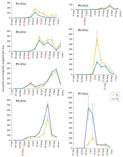 Number of Aonidiella aurantii males trapped on sticky traps per day (mean value with standard error bar) for each treatment (VA: adjusted volume, VC: conventional volume) and for the seven plots (P1–P7) between April and October 2016. The x-axis shows the dates the traps were placed/removed. Dates in red indicate spray applications against A. aurantii.