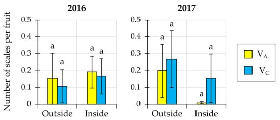 Number of Aonidiella aurantii scales per fruit (mean value with standard error bar) at two depths of the canopy (outside, inside), for both treatments (VA: adjusted volume, VC: conventional volume) and two years (2016 and 2017) considering the plots (P1–P7) as repetitions. Different letters above the bars indicate significant differences (Kruskal-Wallis test, p < 0.05).