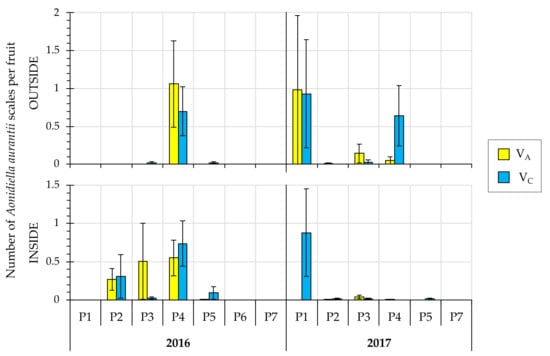 Number of Aonidiella aurantii scales per fruit (mean value with standard error bar) at two depths of the canopy (outside, inside), in function of the treatment (VA: adjusted volume, VC: conventional volume), for each plot (P1–P7) and year (2016 and 2017).