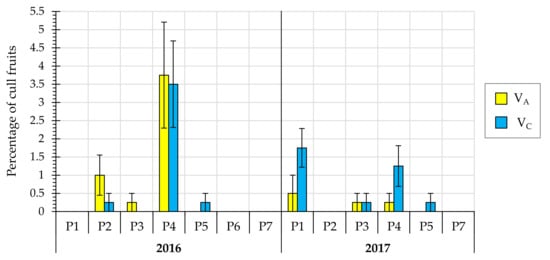 Cull fruit (%) with more than three Aonidiella aurantii scales per fruit (mean value with standard error bar), in function of the treatment (VA: adjusted volume, VC: conventional volume), for each plot (P1–P7) and year (2016 and 2017).