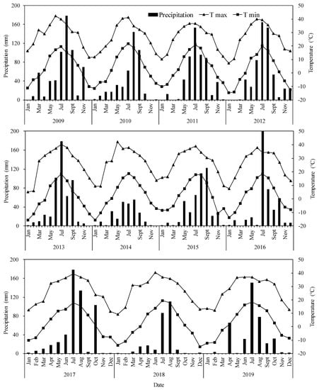 Monthly precipitation and maximum and minimum temperatures from 2009 to 2019 at Dahe station in north-central China.