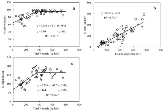 Response of relative yield, N input, and N output as a function of TNsupply. (a). Relationship between TNsupplyy and relative yield. (b). Relationship between TNsupplyy and N input. (c). Relationship between TNsupplyy and N output. “*” means p < 0.05.