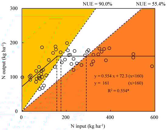 Relationship between N input and N output. The slope of the diagonal wedge represents a range of desired NUE between 55.4% and 90.0%: the orange part means lower values of NUE, which could exacerbate N pollution, while the yellow part means higher values of NUE, which risk mining of soil N stocks. “*” means p < 0.05.