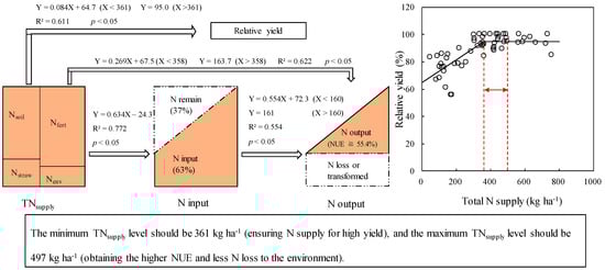 (iii) Optimal supply condition: The Nsoil level was below 100 kg ha−1, and the Nstraw level should be 37 kg ha−1 under this situation. The optimal Nfert should equal the minimum TNsupply (361 kg ha−1) minus the Nstraw, Nenv, and Nsoil. In addition, the maximum Nfert rate cannot exceed the maximum TNsupply (497 kg ha−1) minus the Nstraw, Nenv, and Nsoil. Thus, this is the minimum amount of synthetic N fertilizer to achieve high yields and high NUE with low soil N contents.