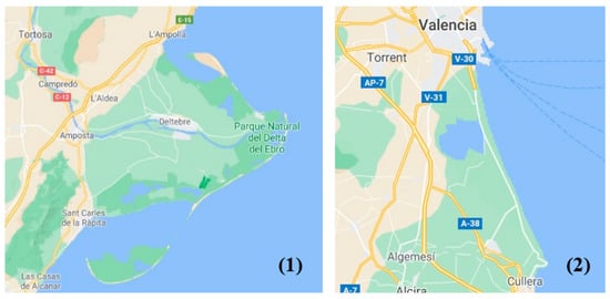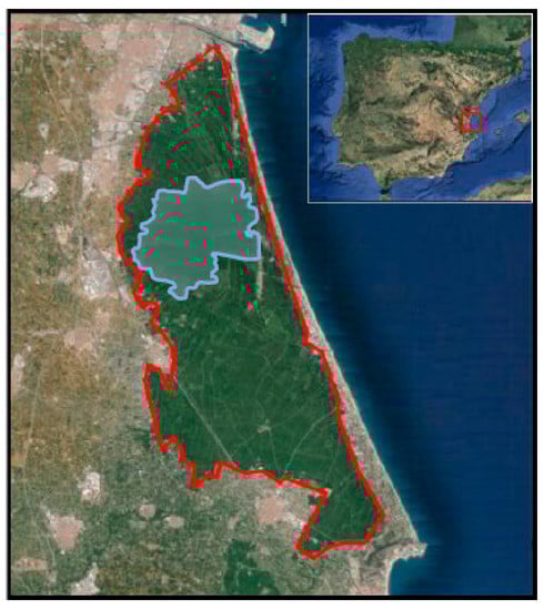 The Albufera Natural Park is located in the eastern coast of Spain (Figure 1). It is a 21,000 ha wetland ecosystem, including a mixture of approximately 14,500 ha of rice fields, a 2800 ha lagoon in the northern part and natural areas close to the coastline [40]. The whole area is surrounded by urban areas and other crops (Figure 2). The climate is Mediterranean, with similar features than those in the Ebro Delta. The precipitation is normally between 400–500 mm/year, and it is mostly concentrated in autumn and spring.