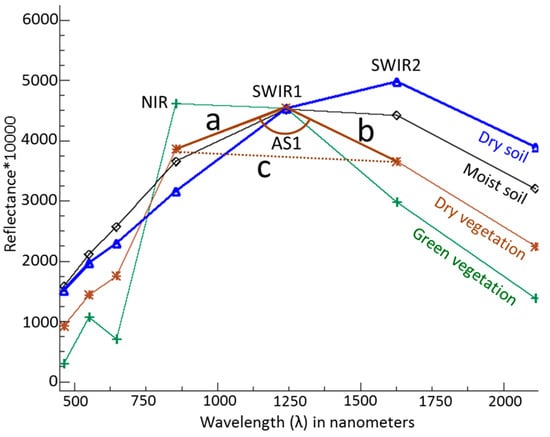 where a, b, c are the Euclidean distances between RNIR, RSWIR1 and RSWIR2, d is the difference between λSWIR2 and λNIR and AS1 is the angle at the SWIR1 vertex. A more detailed explanation can be found in Khanna et al. (2007).