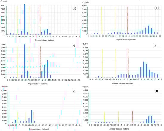 Histograms of angular distances in radians in 2012 in the study sites for NDVI (left) and SASI (right): Ebro Delta (a,b), Albufera National Park (c,d) and Orellana (e,f).