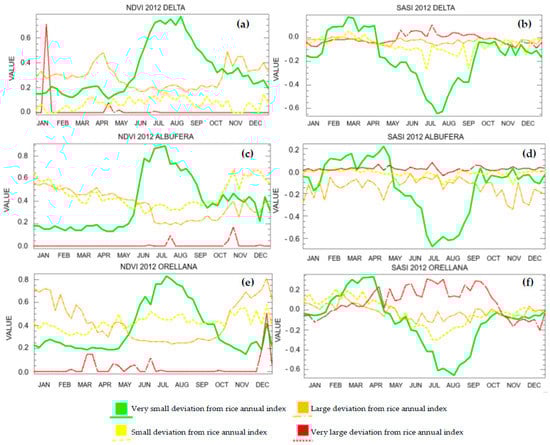 Examples of NDVI (a,c,e) and SASI (b,d,f) annual patterns for each category in Ebro Delta, Albufera, and Orellana, respectively. Green color indicates annual profiles similar to the reference rice profile.