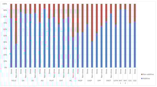Proportion of additive (lower bar) and non-additive (upper bar) genetic variance for grain yield and other agronomic traits under stress, non-stress, and across test environments in a diallel among 20 early pro-vitamin A inbred lines.