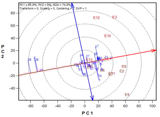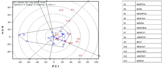 The data on grain yield was subjected to GGE biplot analysis to decompose the G × E interactions as described by [42]. The GGE biplot focused on the first two principal components (PC1 and PC2) derived by subjecting the environment centered grain yield means for each location to singular value decomposition. The data were not transformed (Transform = 0), not standardize (Scale = 0), and were environment-centered (Centering = 2). This provided information on the hybrids that were suitable for the different environments and investigation of stability of hybrids in the various environments.