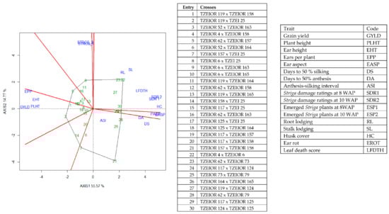 A vector view of the genotype-by-trait biplot showing interrelationships among all traits of 196 early maturing pro-vitamin A hybrid maize evaluated under Striga infestation at Mokwa in 2016 and 2017 and at Abuja in 2017. The biplot was based on genotype-focused singular value partitioning (‘SVP = 2) and is therefore appropriate for visualizing the relationships among traits. Principal component (axis 1) and axis 2 for model 2 explained 70.34% of the variation among traits.