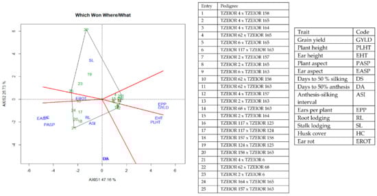 A polygon view of genotype by trait showing top 15 hybrids and the least 10 hybrids among the 196 testcrosses evaluated under optimal conditions at Bagauda, Kadawa, Abuja, Ikenne and Mokwa, Nigeria in 2016 and 2017. The biplot was based on genotype-focused singular value partitioning (‘SVP = 2). Principal component (axis 1) and axis 2 for model 2 explained 64.76% of the variation among traits.