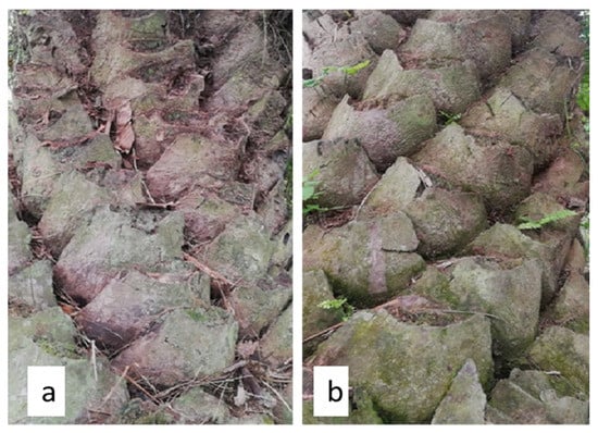 Spiral directions of left- and right-handed phyllotaxis palm trunks: (a) left-handed palm and (b) right-handed palm trunk.