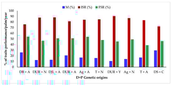 Additionally, the parental origins had similar trend performance for M, ISR, and FSR, as shown in Figure 2. An increase in male production enhanced a decline in ISR, and because of this negative relationship between M and ISR, enhanced an increase in FSR; the more male inflorescences that are produced, the better for pollination. Therefore, normal fruit set in oil palm could be realized when ISR reaches a 75% critical level availability of E. kamerunicus, backed by favorable environmental factors with good management practices. As illustrated in Figure 2, Deli Serdang × Cameroon was statistically different from other parental lines.