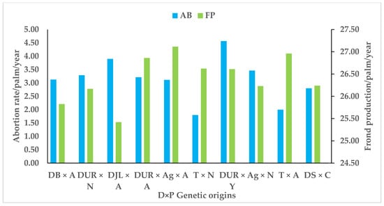 Mean performance of frond production and abortion rate among genetic origins per palm per year. AB, abortion (palm−1 yr−1); FP, frond production; Ag, Angola; A, AVROS (Algemene Vereniging rubber planters); N, Nigeria; C, Cameroon; DJL, Deli Johor Labis; DUR, Deli Ulu Remis; T, Tanzania; Y, Yangambi; DB, deli Banting.