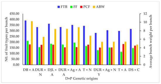 In the present study, the performance of average bunch weight (ABW), fruit to bunch (FTB), fertile fruit (FF), and infertile fruit (PCF) among the parental origins is presented in Figure 4, which exhibits a positive relationship between ABW, FTB, and FF. An increase in FTB led to an increase in ABW coupled with an increase in FF. The parental origin means for ABW, FTB, FF, and PCF were 7.03 kg bunch−1, 330.71 fruits bunch−1, 163.45 fruits bunch−1, and 167.27 fruits bunch−1. However, 40% of the parental origins had ABW and FF above their respective parental means, while 60% had FTB higher than the general parental FTB mean. The ABW in Figure 4 exhibited that Deli Banting × AVROS recorded the highest ABW at 10.26 kg bunch−1, followed by Angola × AVROS (8.84 kg bunch−1), Deli Ulu Remis × AVROS (8.45 kg bunch−1), and Deli Johor Labis × AVROS (8.42 kg bunch−1). Analogous values of their ABWs occurred because the same AVROS pisifera was used as a male parent in their hybridization process. The lowest ABW was observed in Deli Serdang × Cameroon at 4.75 (kg bunch−1).