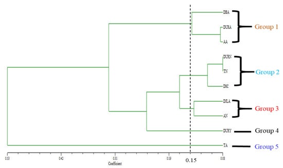 Dendrogram showing relationship amid dura and pisifera genetic origins based on their quantitative characters: A, AVROS; DBA, Deli Banting × AVROS; DURN, Deli Ulu Remis × Nigeria; DJLA, Deli Johor Labis × AVROS; DURA, Deli Ulu Remis × AVROS; AA, Angola × AVROS; TN, Tanzania × Nigeria; DURY, Deli Ulu Remis × Yagambi; AN, Angola × Nigeria; TA, Tanzania × AVROS; DSC, Deli Serdang × Cameroon.