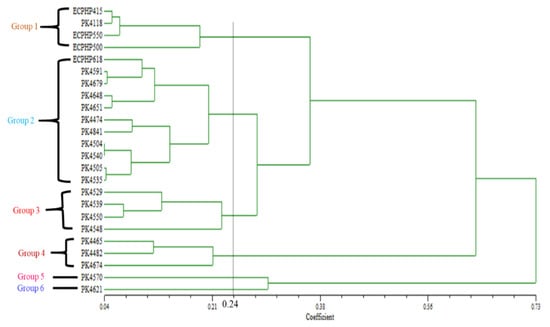 The UPGMA dendrogram was formed based on nine morphological traits. The parental origins were clustered into five major groups at 0.15 coefficient level (Figure 5), which exhibited genetic variation among parents. Similarly, the 24 progenies were clustered into six major groups at a 0.24 coefficient level, which indicated a high level of genetic influence among the progenies (Figure 6). For parents, Cluster I and II unified three parents’ subclusters. Cluster III had two parents, while Clusters IV and V had one parent each. In regards to progenies, Clusters I and III comprised four progenies each with subclusters. Clusters II integrated 11 members with the highest subclusters of progenies, Cluster IV had three progenies with subclusters individually, while V and VI had one progeny each with no subcluster.
