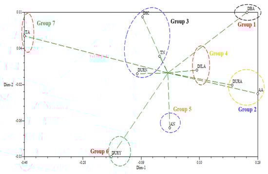 Two-dimensional plot of principal integral component analysis showing relationships among dura and pisifera parental origins: (A) AVROS, (DBA) Deli Banting × AVROS, (DURN) Deli Ulu Remis × Nigeria, (DJLA) Deli Johor Labis × AVROS, (DURA) Deli Ulu Remis × AVROS, (AA) Angola × AVROS, (TN) Tanzania × Nigeria, (DURY) Deli Ulu Remis × Yagambi, (AN) Angola × Nigeria, (TA) Tanzania × AVROS, and (DSC) Deli Serdang × Cameroon.