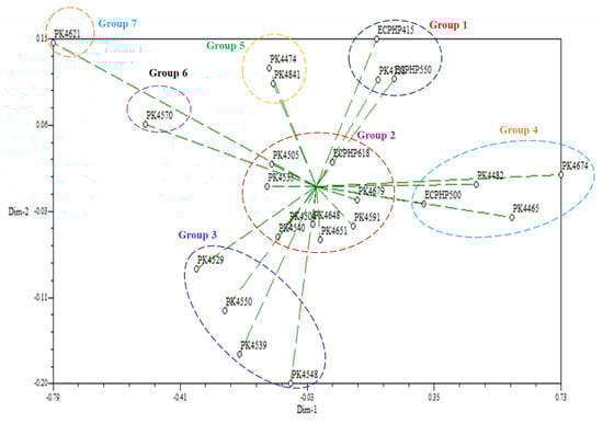 In this study, seven groups were formed on the two-dimensional PCA for parents and progenies, which exhibited variances in results with that of the cluster analysis of each category. For parents, Group II of PCA had two parents, whereas Group III comprised three parents and Groups I, IV, V, VI, and VII had one parent each. For the progenies, Group I of PCA comprised three progenies, Group II had nine progenies, Groups III and IV comprised four progenies each, Group V had two progenies, and Groups VI and VII had one progeny each (Figure 8).