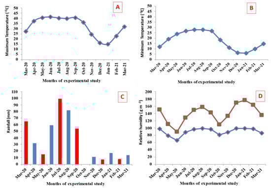 Maximum and minimum air temperatures (A,B), rainfall (C) and maximum and minimum relative humidity (D) during the experimental period from March 2020 to March 2021.